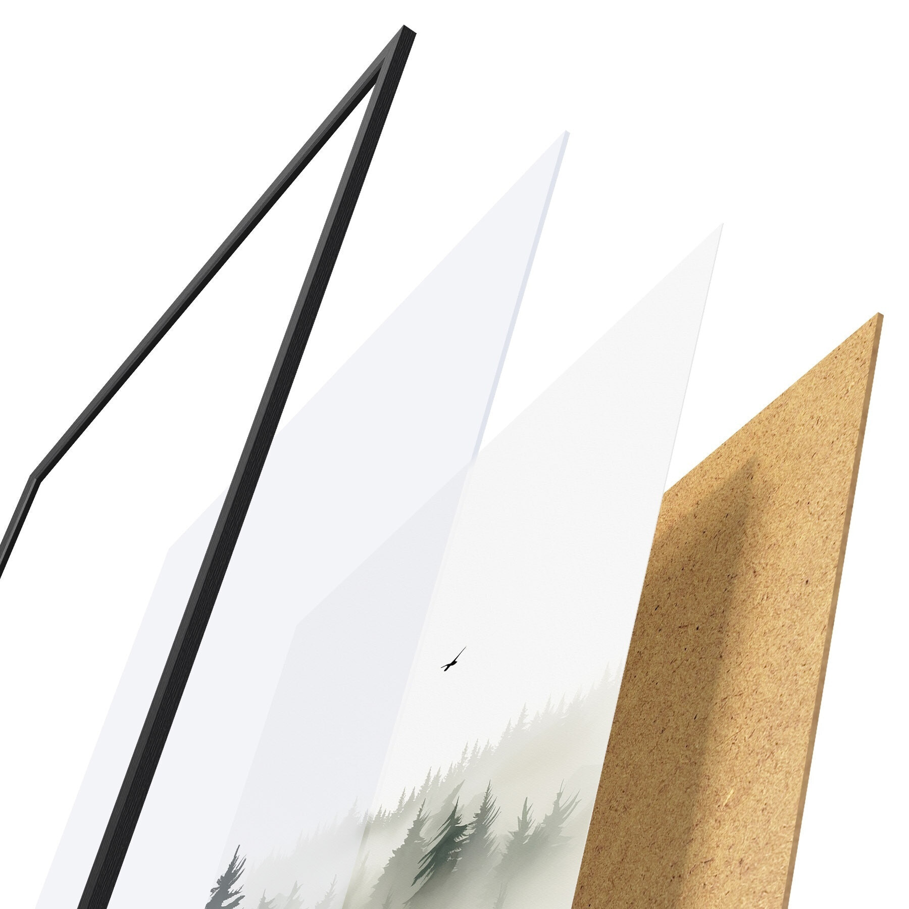 A poszter keretből, plexiből, nyomtatott képből és forgácslap hátlapból áll. A poszter a hátoldalon található rögzítőknek köszönhetően azonnal felakasztható a falra.