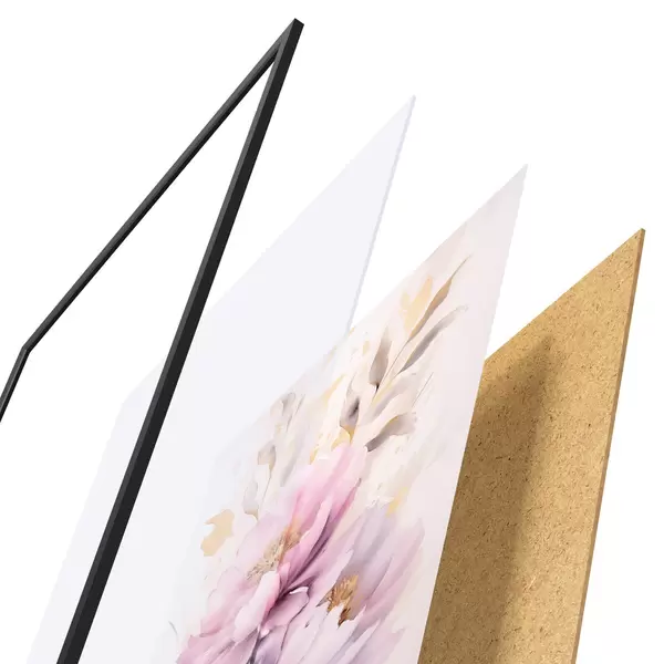 A poszter keretből, plexiből, nyomtatott képből és forgácslap hátlapból áll. A poszter a hátoldalon található rögzítőknek köszönhetően azonnal felakasztható a falra.