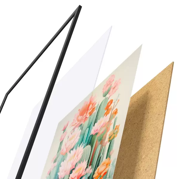 A poszter keretből, plexiből, nyomtatott képből és forgácslap hátlapból áll. A poszter a hátoldalon található rögzítőknek köszönhetően azonnal felakasztható a falra.