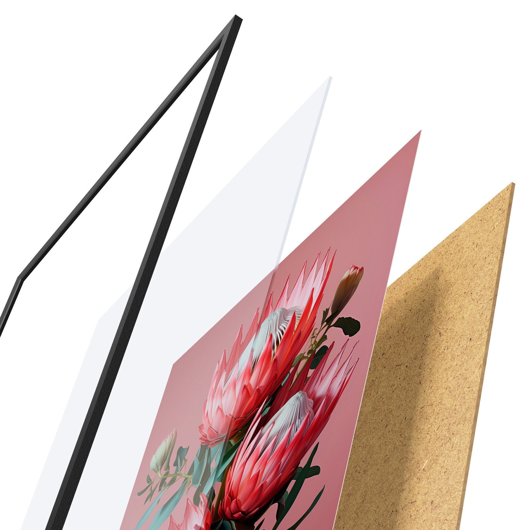 A poszter keretből, plexiből, nyomtatott képből és forgácslap hátlapból áll. A poszter a hátoldalon található rögzítőknek köszönhetően azonnal felakasztható a falra.