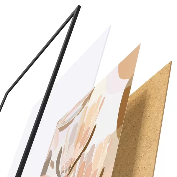 A poszter keretből, plexiből, nyomtatott képből és forgácslap hátlapból áll. A poszter a hátoldalon található rögzítőknek köszönhetően azonnal felakasztható a falra.