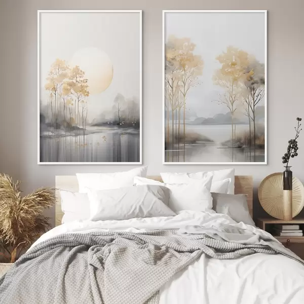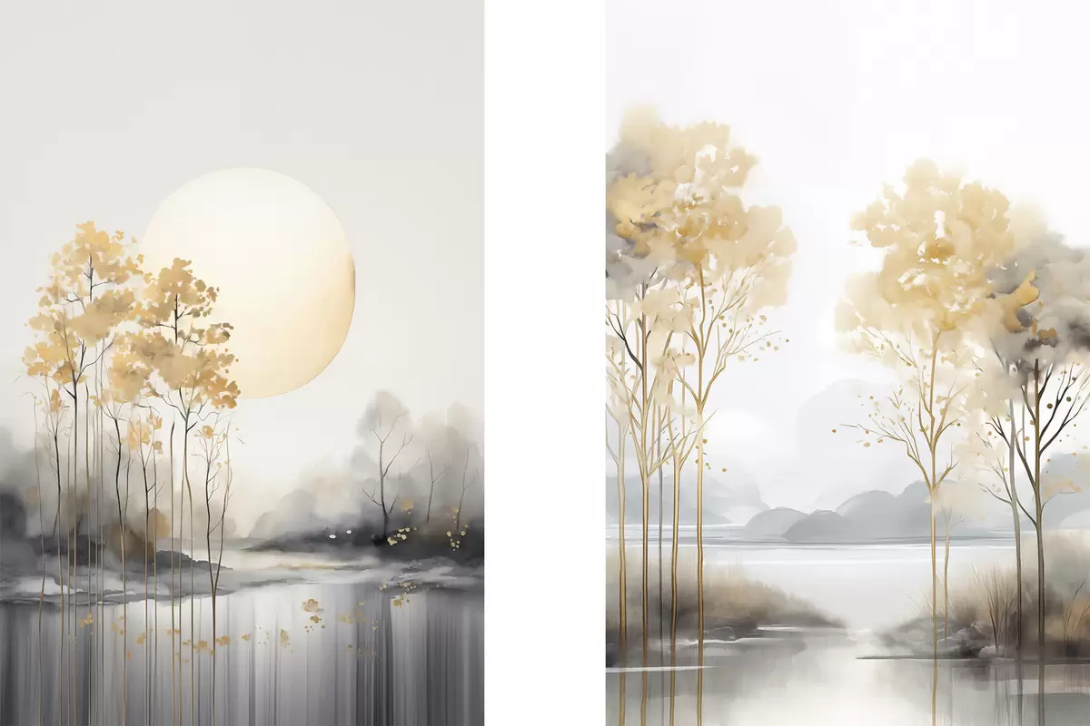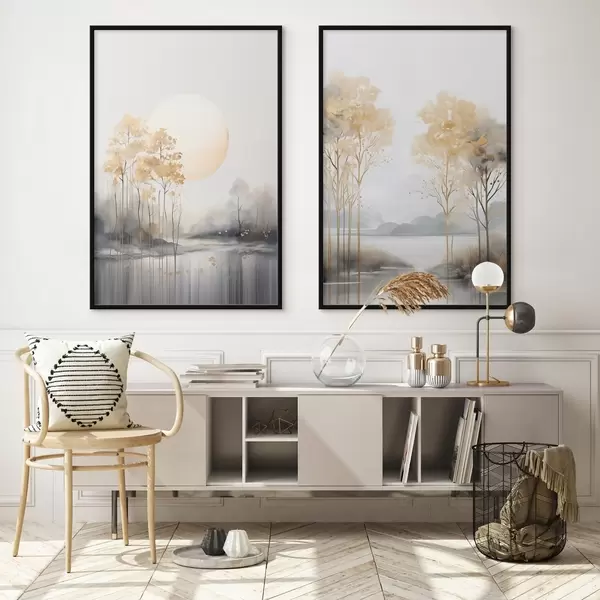 Poster Dekoratív absztrakt táj, magas fák sárga levelekkel, folyó és köd a háttérben Nr d01115
