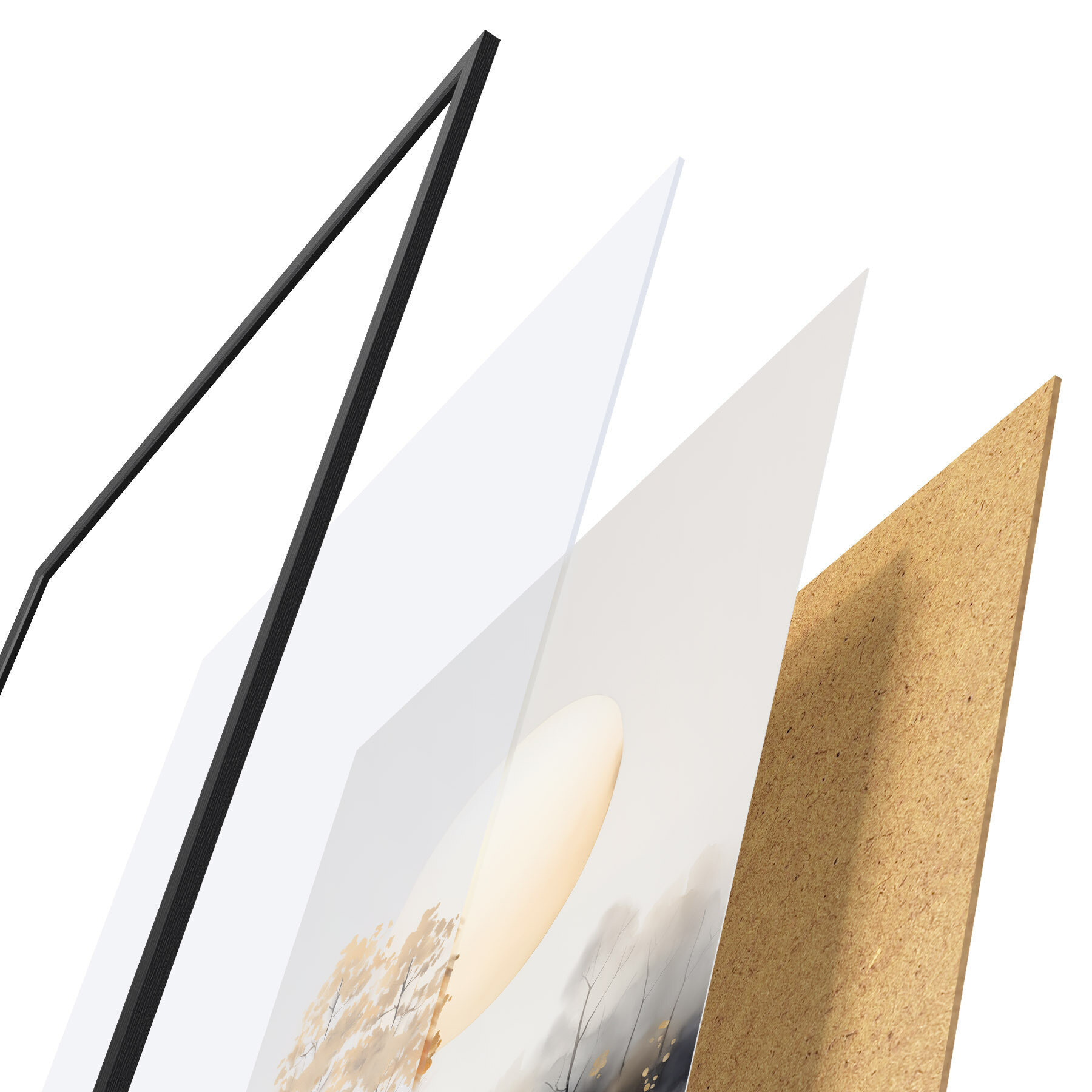 A poszter keretből, plexiből, nyomtatott képből és forgácslap hátlapból áll. A poszter a hátoldalon található rögzítőknek köszönhetően azonnal felakasztható a falra.