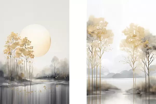 Poster Dekoratív absztrakt táj, magas fák sárga levelekkel, folyó és köd a háttérben Nr d01115