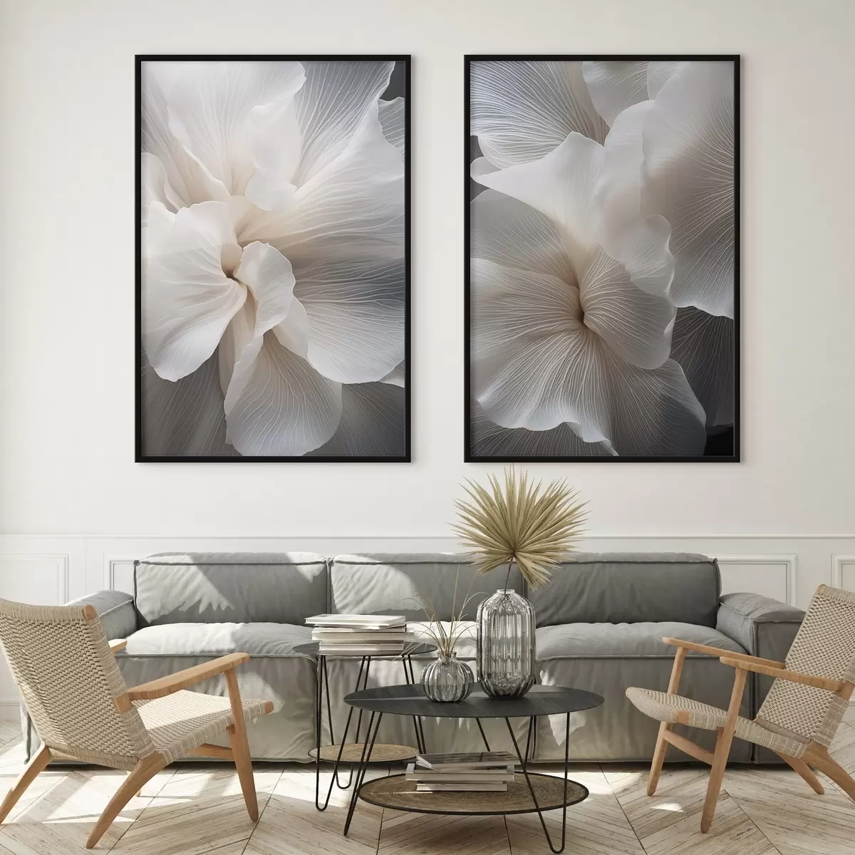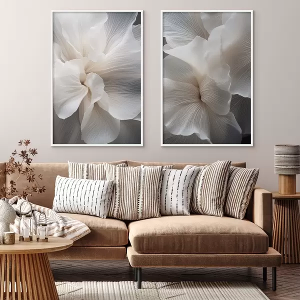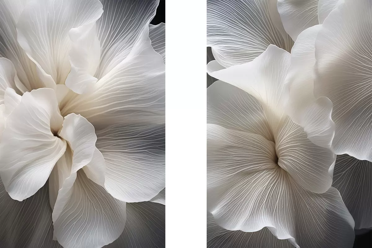 Poster Közelkép finom, absztrakt fehér virágszirmokról, bonyolult vonalakkal és elmosódott sötét háttérrel Nr d01117