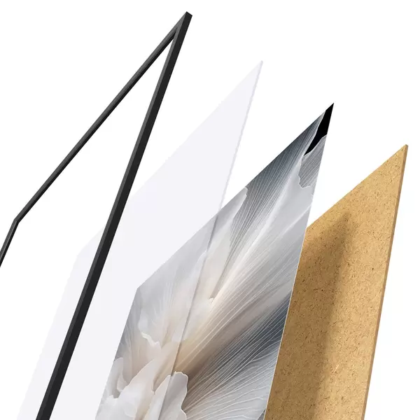 A poszter keretből, plexiből, nyomtatott képből és forgácslap hátlapból áll. A poszter a hátoldalon található rögzítőknek köszönhetően azonnal felakasztható a falra.