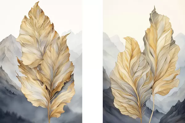 Poster Absztrakt, nagy, sárga és barna levelek bonyolult részletekkel, hegyvidéki tájjal a háttérben Nr d01119