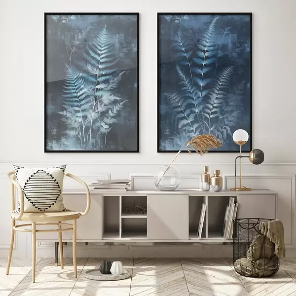 Poster Kék páfrányok és növények sötét, texturált háttér előtt, a bonyolult részletekre összpontosítva, röntgenhatás Nr d01121