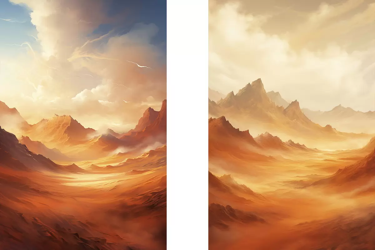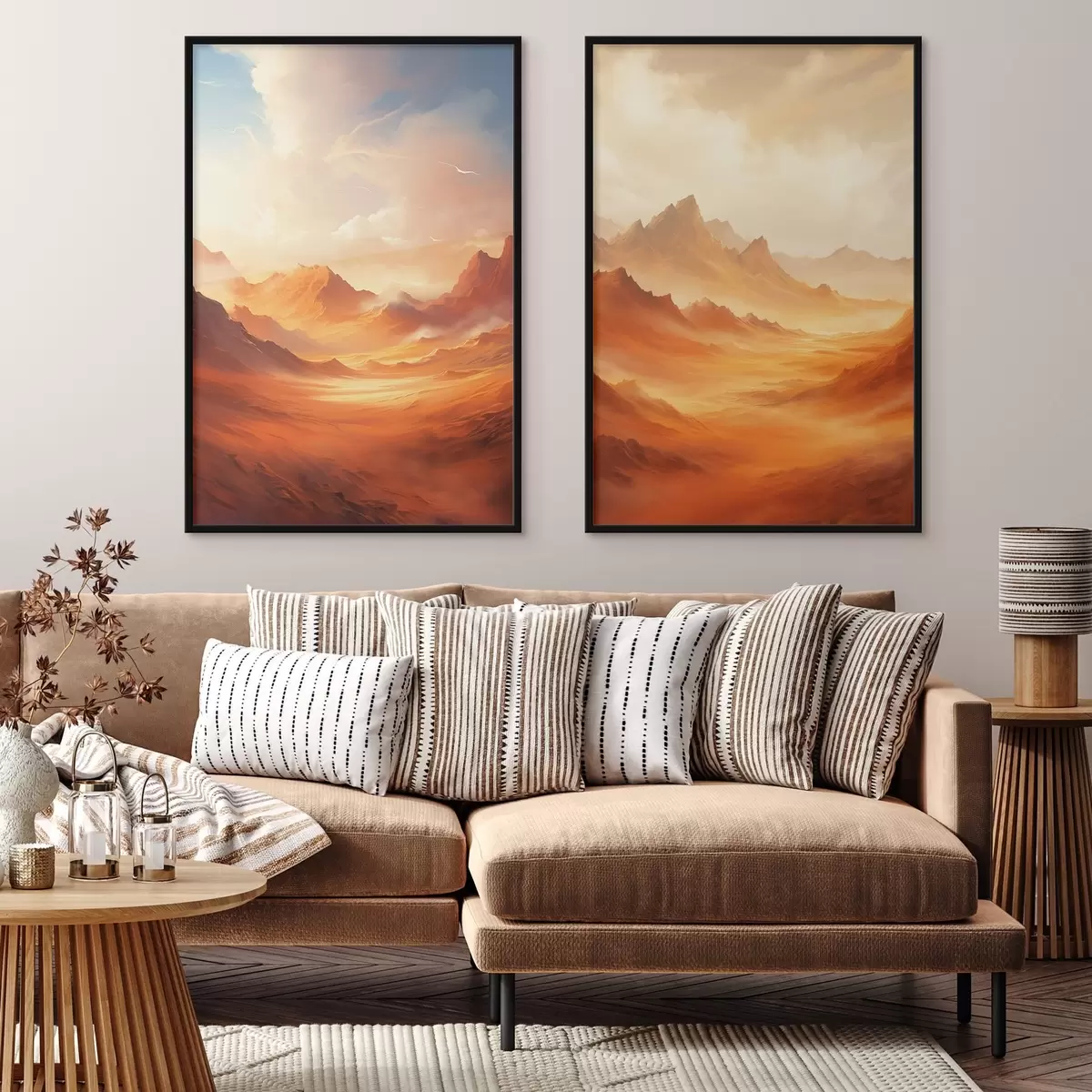 Poster Hatalmas, narancssárga sivatagi táj, magas, sziklás hegyekkel, ködös, napsütötte égbolton, vékony felhőkkel. Nr d01122