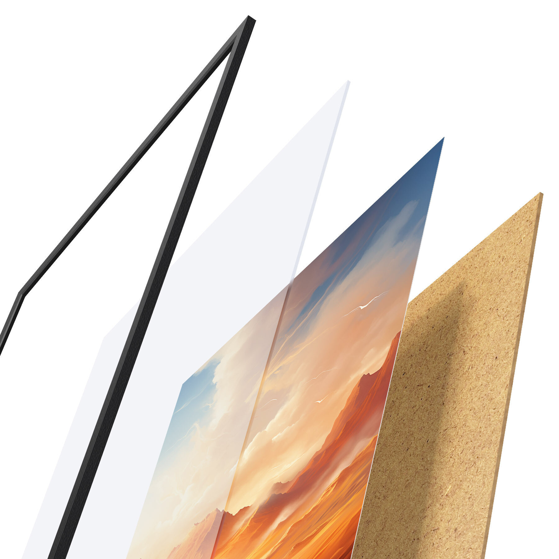 A poszter keretből, plexiből, nyomtatott képből és forgácslap hátlapból áll. A poszter a hátoldalon található rögzítőknek köszönhetően azonnal felakasztható a falra.