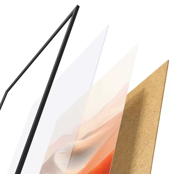 A poszter keretből, plexiből, nyomtatott képből és forgácslap hátlapból áll. A poszter a hátoldalon található rögzítőknek köszönhetően azonnal felakasztható a falra.