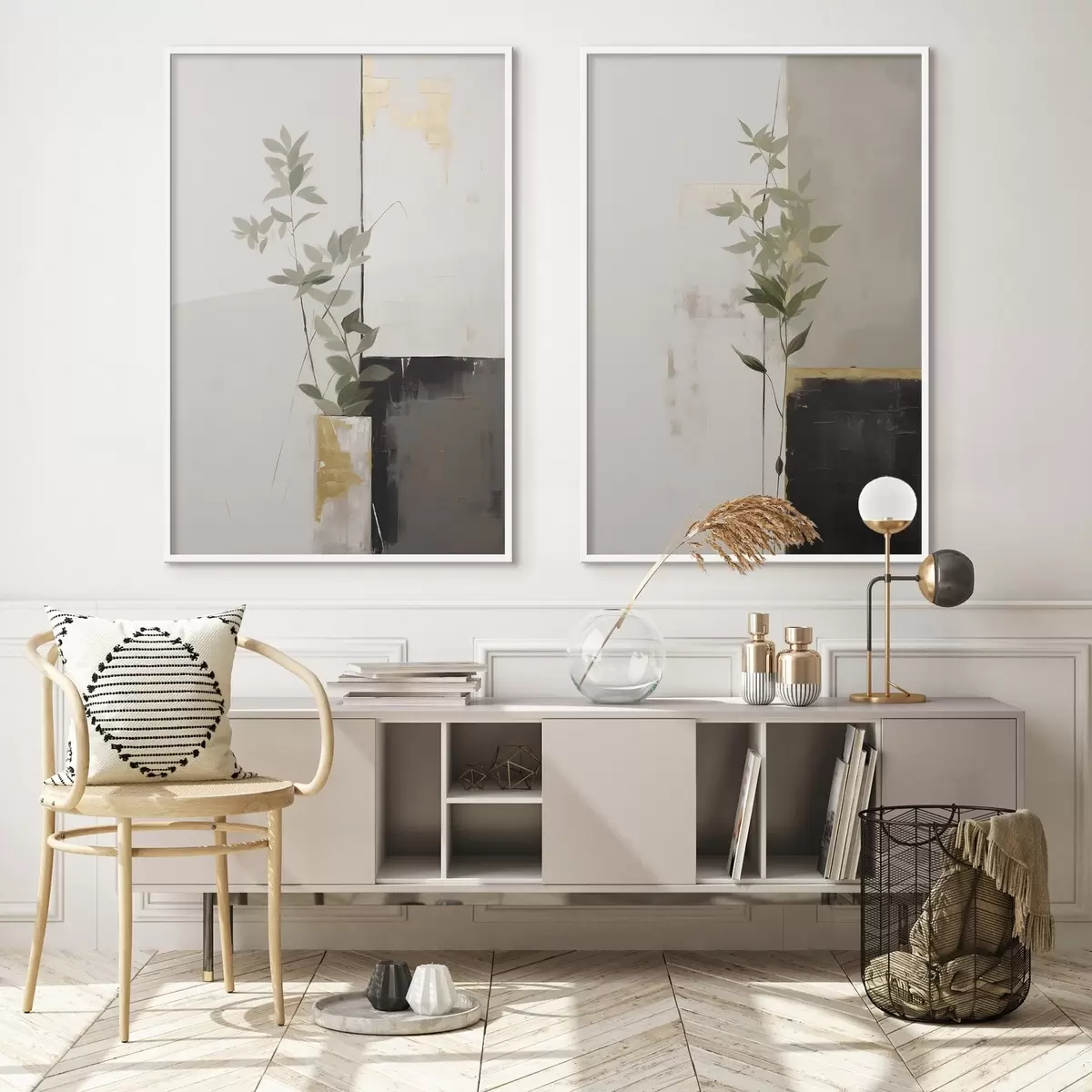 Plakát a sziklán Minimalista textúrájú festmény, amelyen egy vázát és zöld leveleket ábrázolnak absztrakt geometriai alakzatok háttérében. d01126