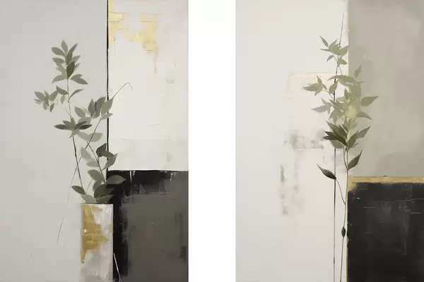 Poster Minimalista textúrájú festmény, amelyen egy vázát és zöld leveleket ábrázolnak absztrakt geometriai alakzatok háttérében. Nr d01126
