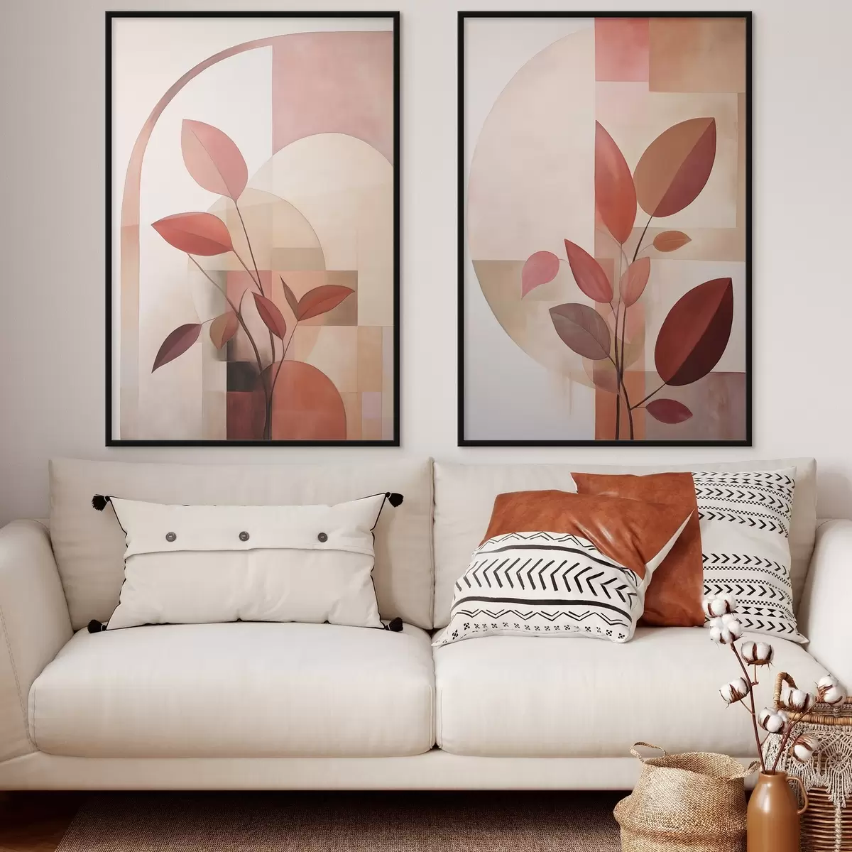 Poster Absztrakt növény vörös levelekkel, geometrikus formák és lágy, tompított színekkel a háttérben Nr d01128