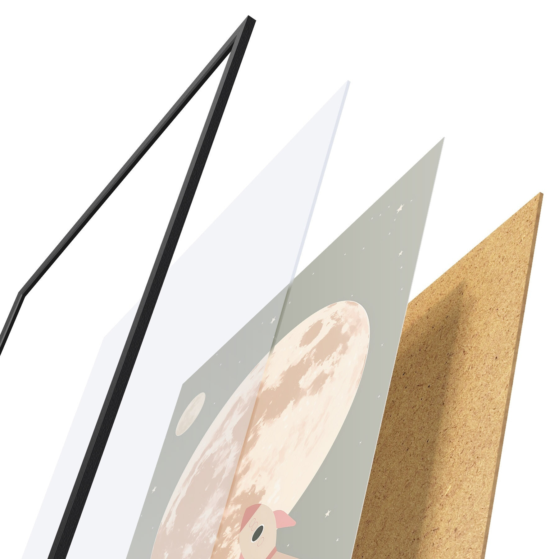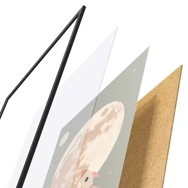 A poszter keretből, plexiből, nyomtatott képből és forgácslap hátlapból áll. A poszter a hátoldalon található rögzítőknek köszönhetően azonnal felakasztható a falra.