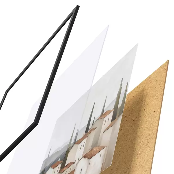 A poszter keretből, plexiből, nyomtatott képből és forgácslap hátlapból áll. A poszter a hátoldalon található rögzítőknek köszönhetően azonnal felakasztható a falra.