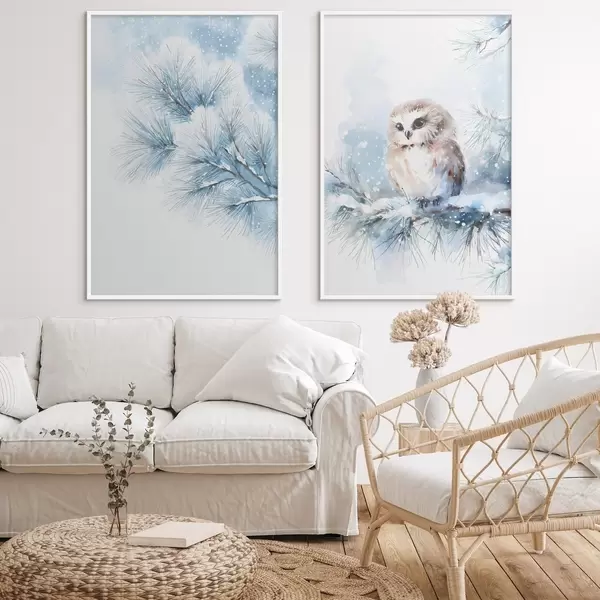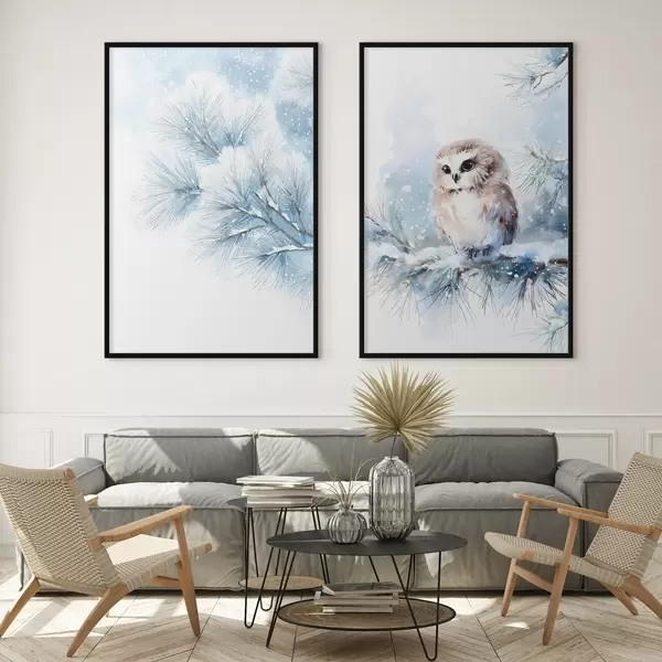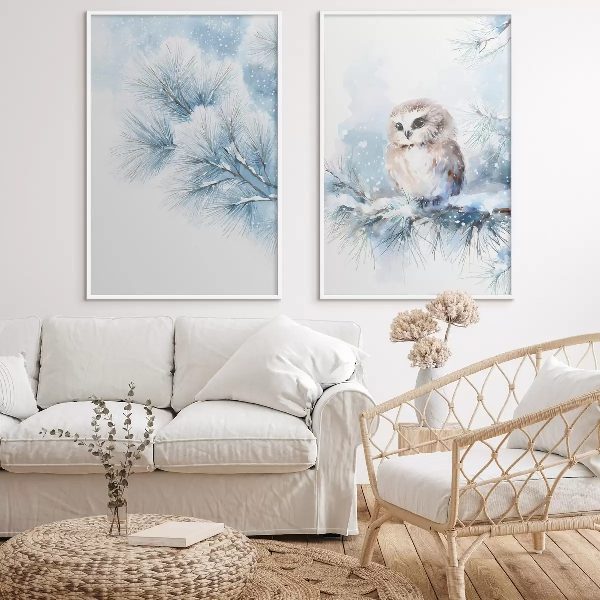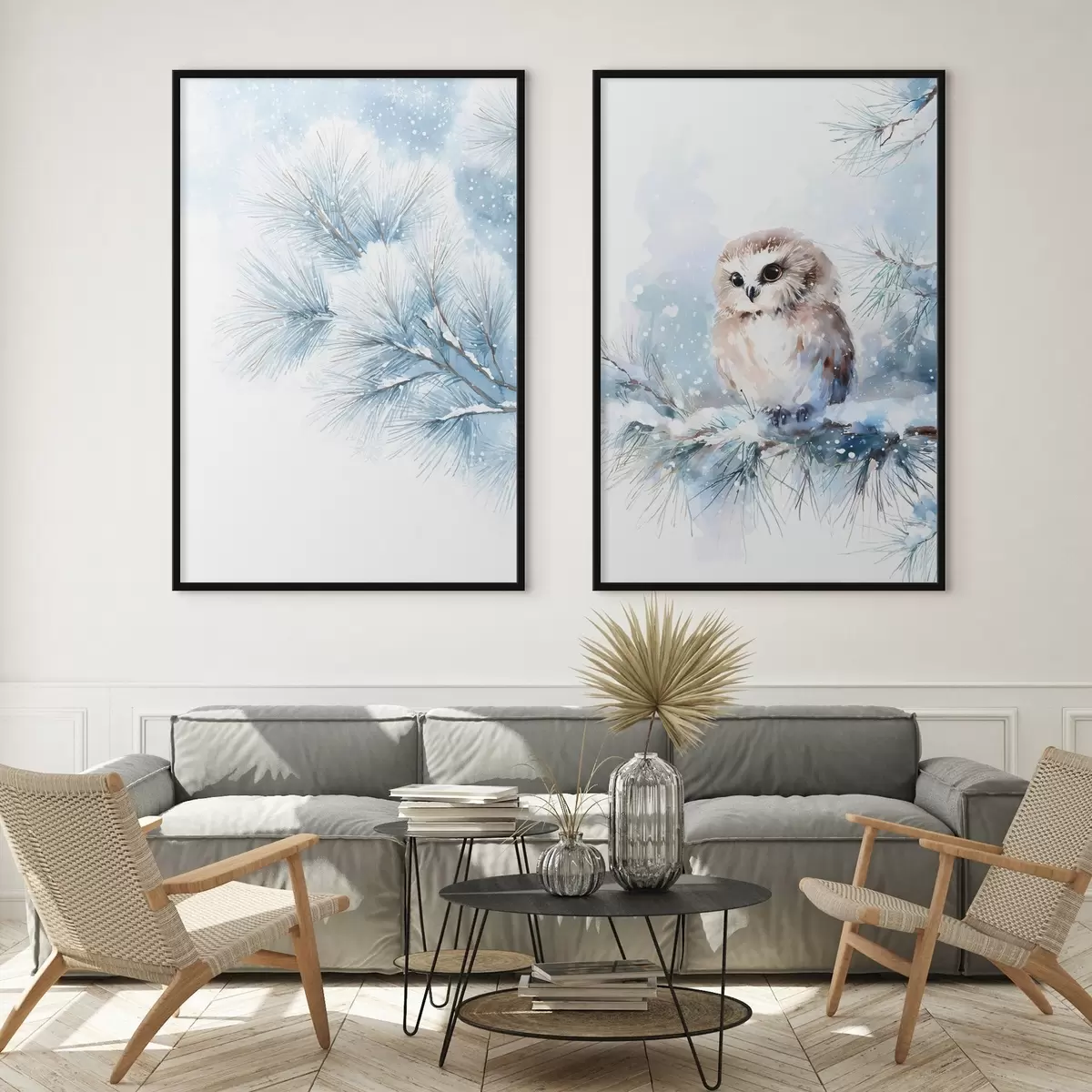 Poster cuki bagoly egy hóval borított fenyőágon, akvarell stílusban Nr d01168
