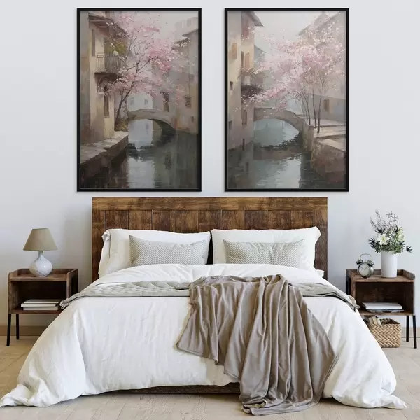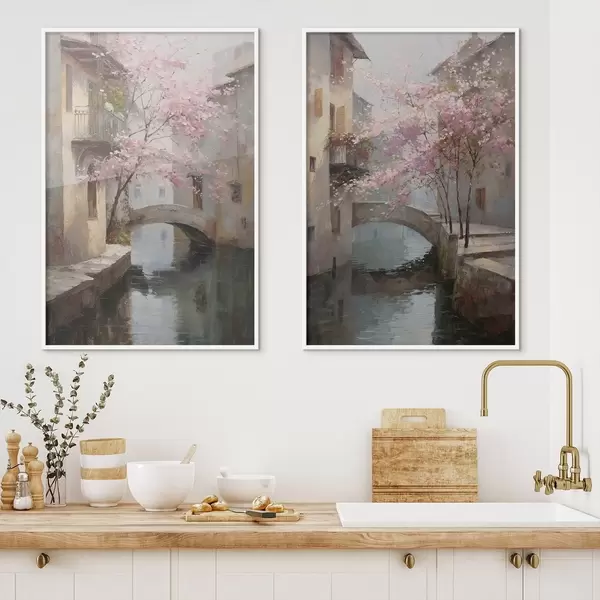 Poster romantikus városi tájkép virágzó fával, olajfestmény stílusban Nr d01173