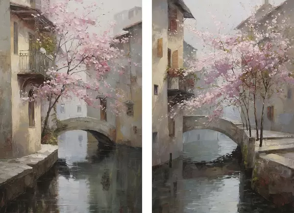 Poster romantikus városi tájkép virágzó fával, olajfestmény stílusban Nr d01173