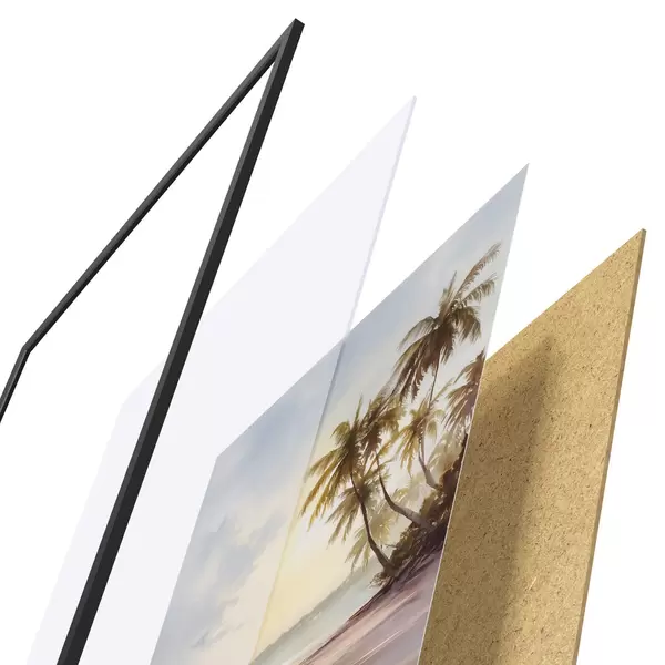 A poszter keretből, plexiből, nyomtatott képből és forgácslap hátlapból áll. A poszter a hátoldalon található rögzítőknek köszönhetően azonnal felakasztható a falra.
