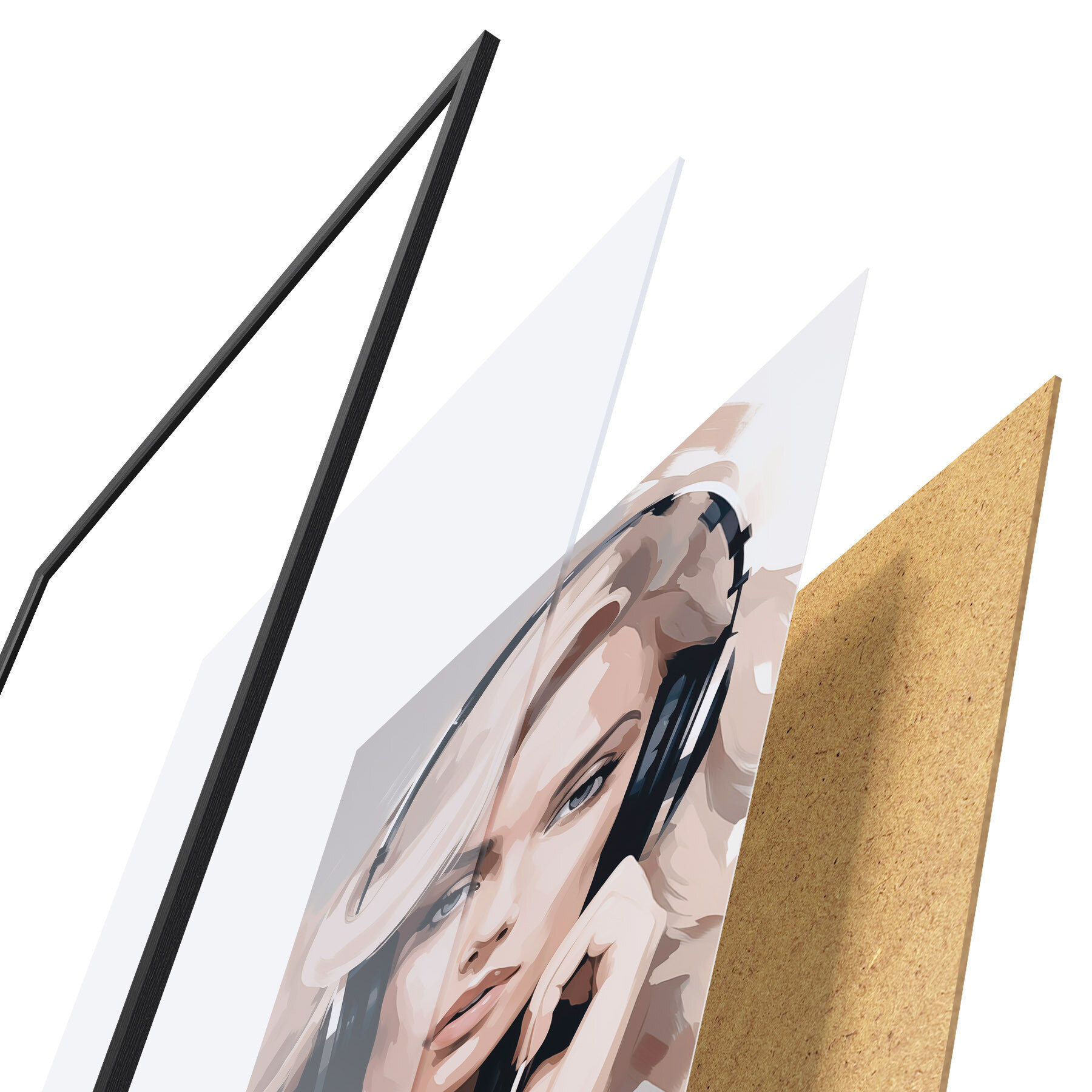 A poszter keretből, plexiből, nyomtatott képből és forgácslap hátlapból áll. A poszter a hátoldalon található rögzítőknek köszönhetően azonnal felakasztható a falra.