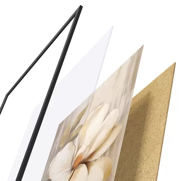 A poszter keretből, plexiből, nyomtatott képből és forgácslap hátlapból áll. A poszter a hátoldalon található rögzítőknek köszönhetően azonnal felakasztható a falra.