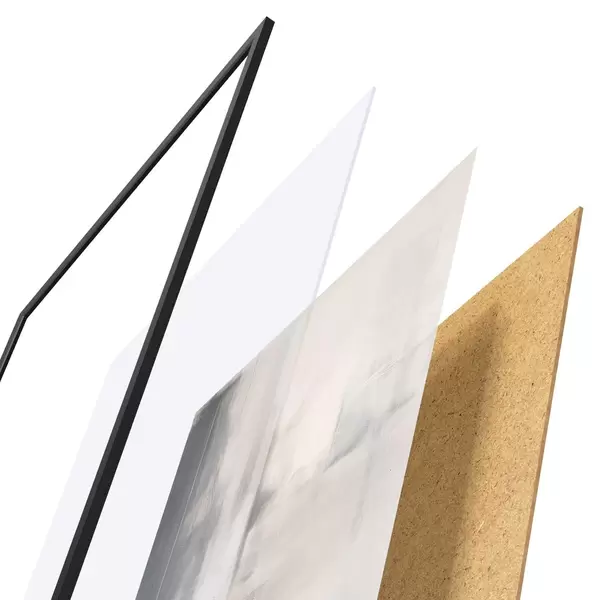 A poszter keretből, plexiből, nyomtatott képből és forgácslap hátlapból áll. A poszter a hátoldalon található rögzítőknek köszönhetően azonnal felakasztható a falra.
