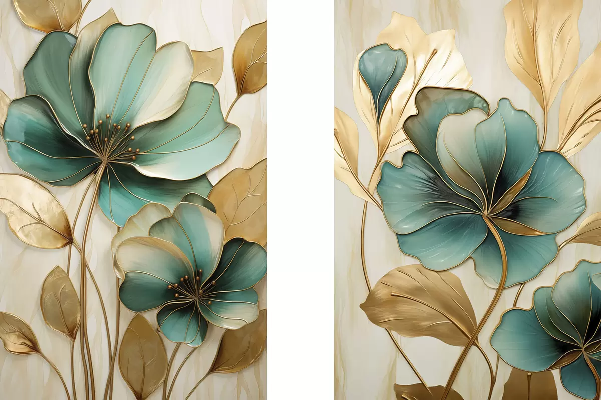 Poster Nagy, kontúrokkal ellátott, kékes-zöld és sárga virágok, sárga levelekkel körülvéve, absztrakt háttér előtt Nr d01235