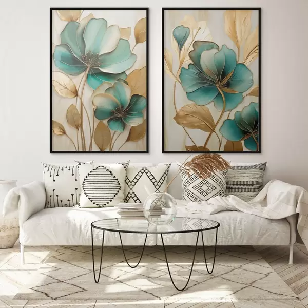Plakát a sziklán Nagy, kontúrokkal ellátott, kékes-zöld és sárga virágok, sárga levelekkel körülvéve, absztrakt háttér előtt d01235