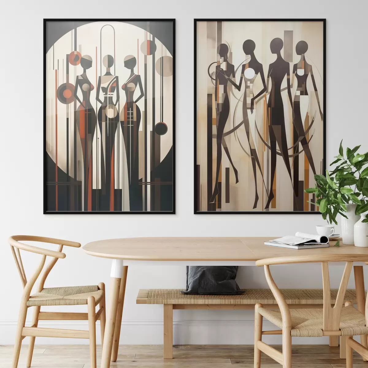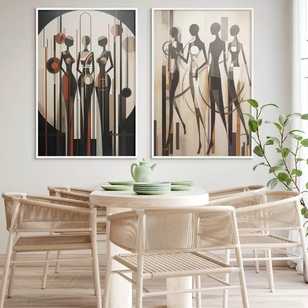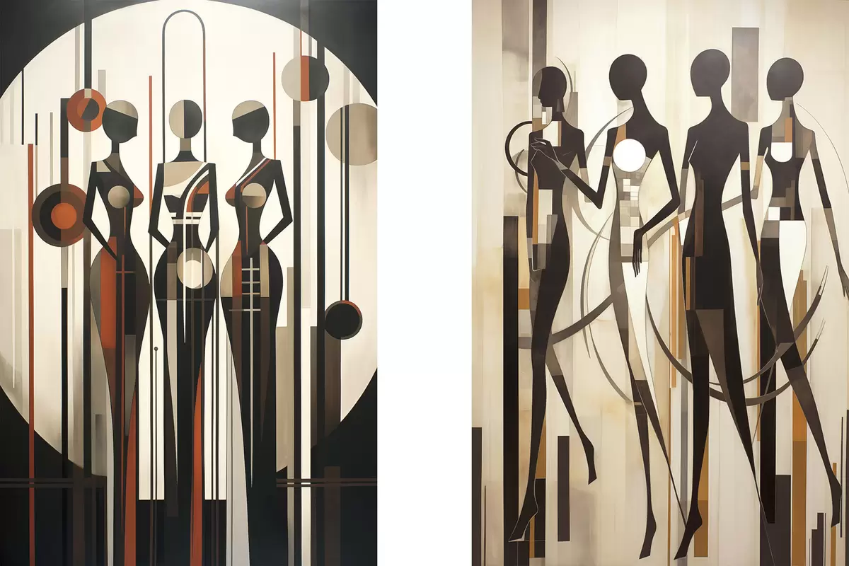 Poster Stilizált női alakok geometrikus elemekkel, függőleges vonalak és körökből álló absztrakt háttér előtt Nr d01237