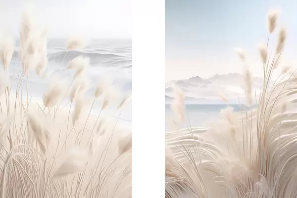 Plakát a sziklán Magas, tollas pampas fű lágy bézs árnyalatokban az előtérben, homokos stranddal a háttérben d01242