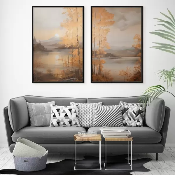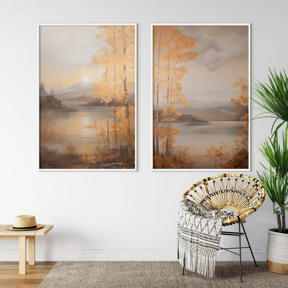 Poster Őszi textúrájú, narancssárga levelű fák keretezik a nyugodt tavat, amelynek túlsó partján a felhős ég alatt távoli hegyek láthatók. Nr d01246