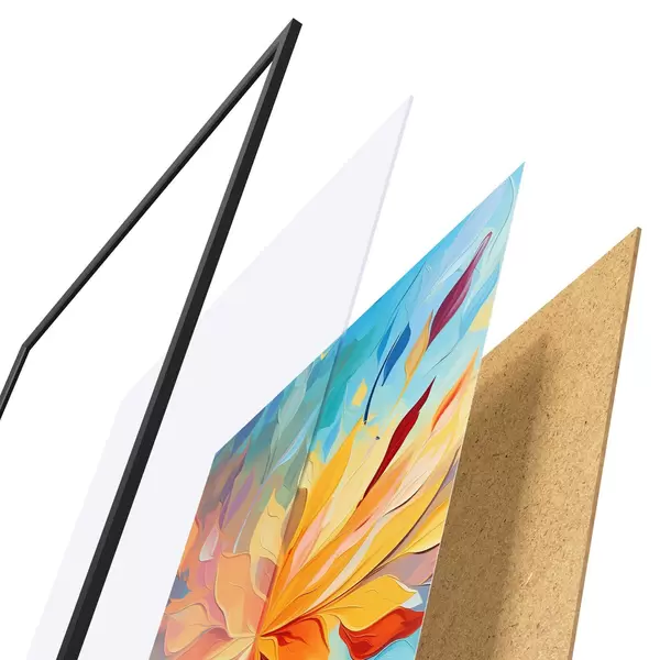 A poszter keretből, plexiből, nyomtatott képből és forgácslap hátlapból áll. A poszter a hátoldalon található rögzítőknek köszönhetően azonnal felakasztható a falra.