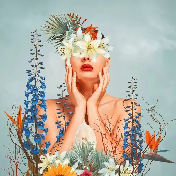 Plakát a sziklán Nő virágokkal az arca körül f37477