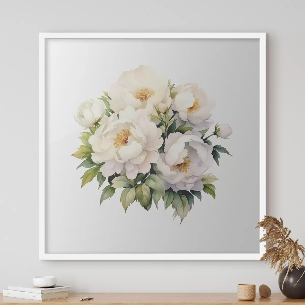 Plakát a sziklán Fehér virágzó bazsarózsa virágok zöld levelekben, akvarell, botanika f38481