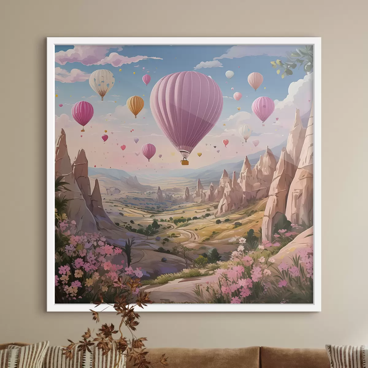 Plakát a sziklán léggömbök a hegyekben virágok felett f38656