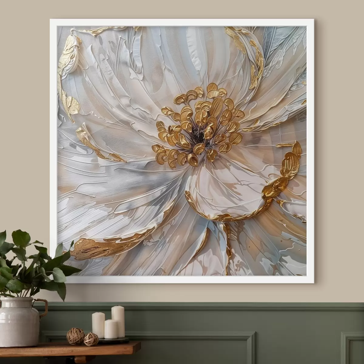 Poster Közelkép egy nagy fehér virágról, sárga porzóval a belsejében, művészi olajfestmény díszítéssel Nr f38755
