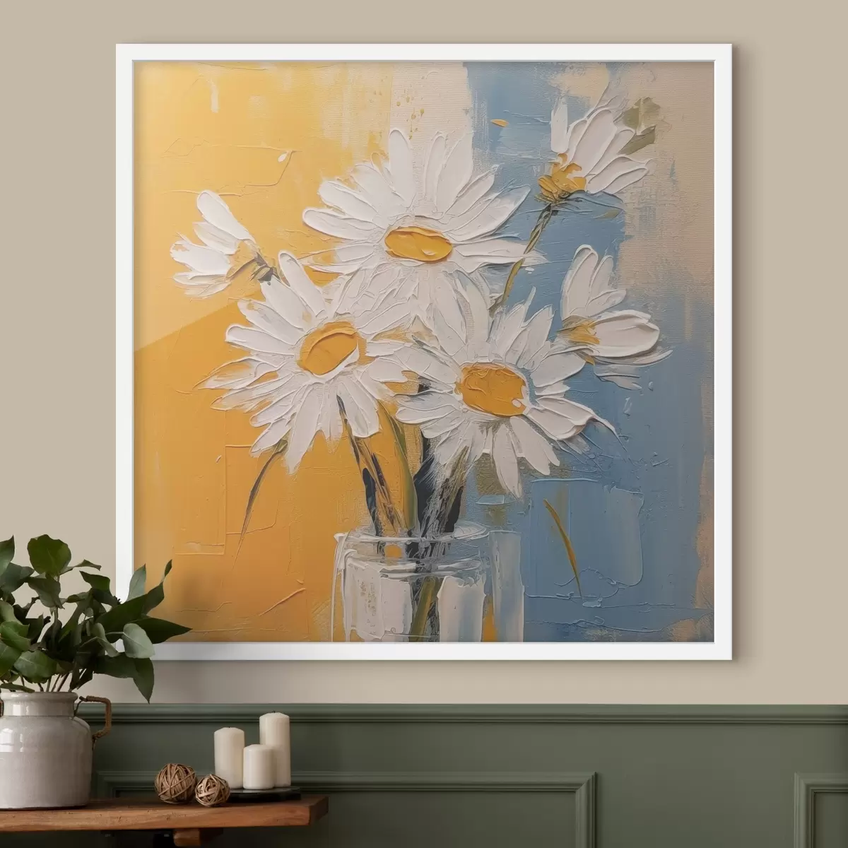 Poster Fehér százszorszépek üvegvázában kék-sárga alapon, olajfestmény utánzata, nagy vonások Nr f38907