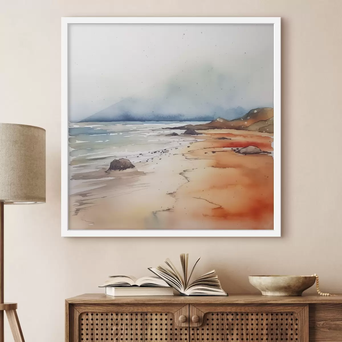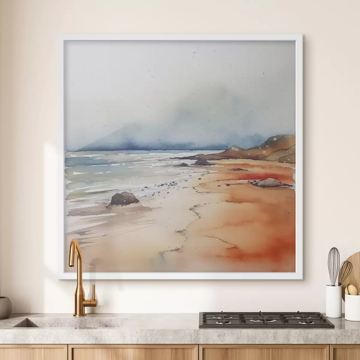 Poster Tenger és tengerpart, eső, akvarell, foltok, táj, tájkép, kék, narancssárga színű Nr f38936