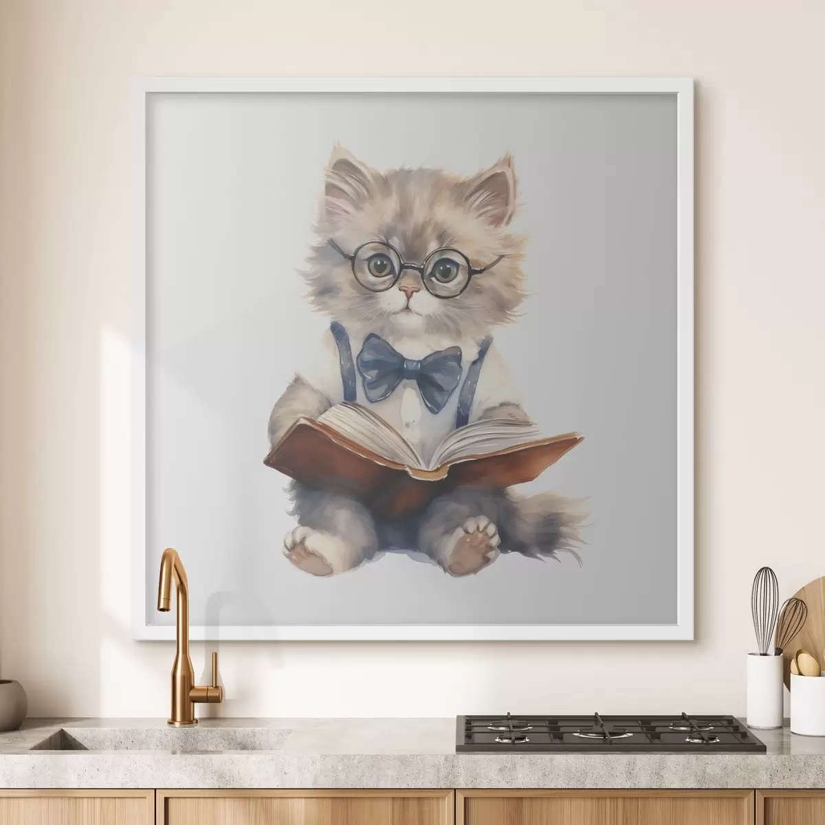 Poster Egy szürke cica fekete szemüvegben és kék öltönyben olvas egy könyvet akvarell Nr f39023