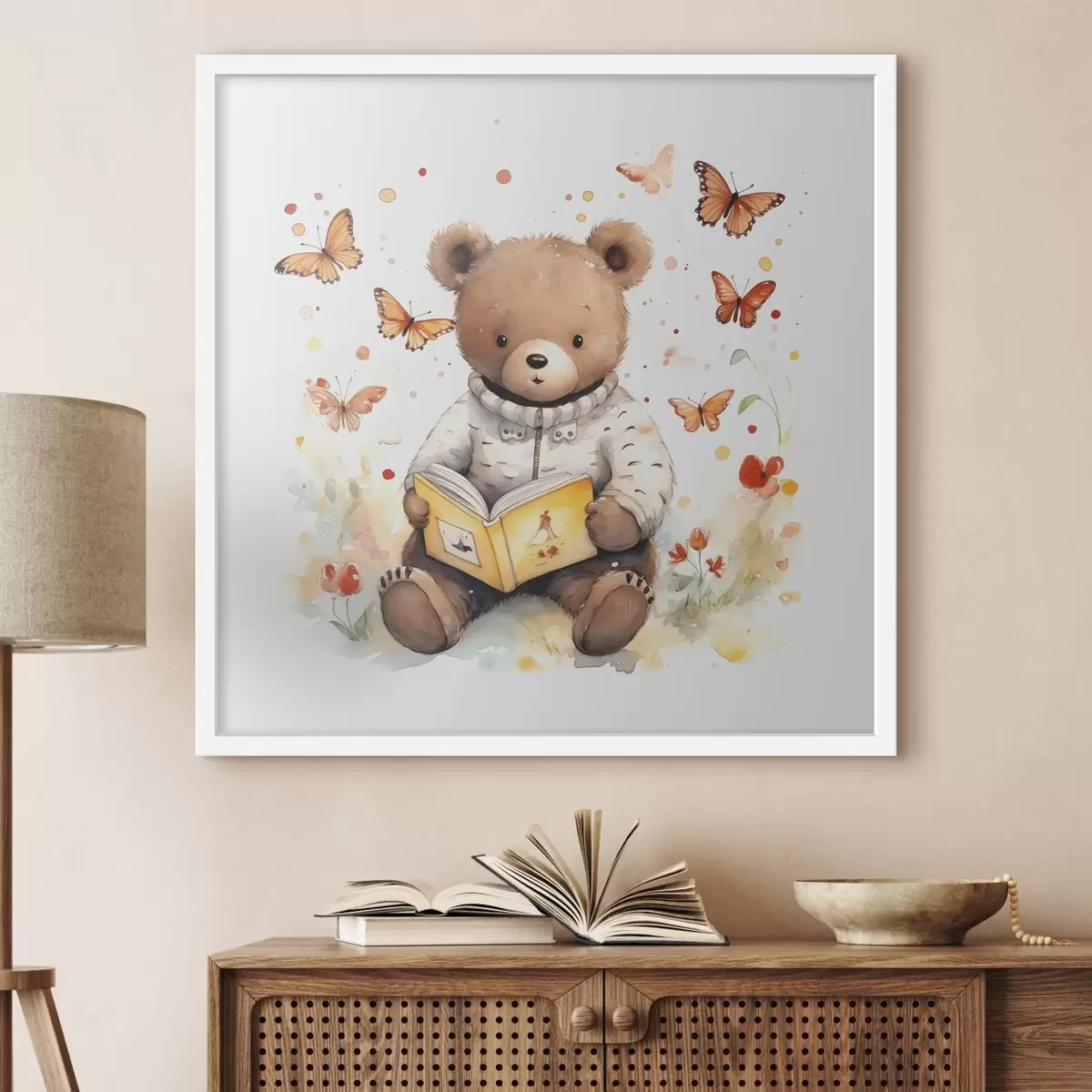 Poster Egy barna medve pulóverben olvas egy könyvet, amelyet akvarell pillangók vesznek körül Nr f39025