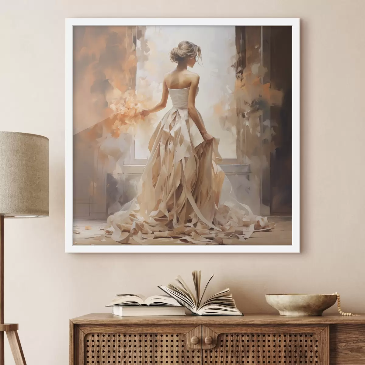 Poster Egy fehér menyasszonyi ruhás lány áll az ablaknál a tűz mellett, és kézzel fest Nr f39125
