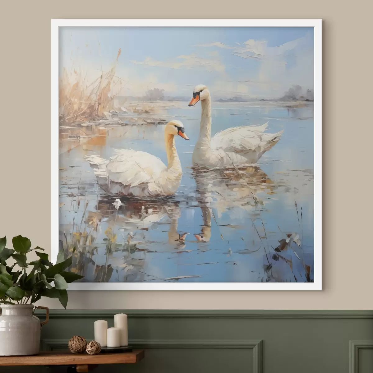 Poster Fehér libák úsznak a folyó mentén a nádasok között, kék, fehér, bézs színben Nr f39130