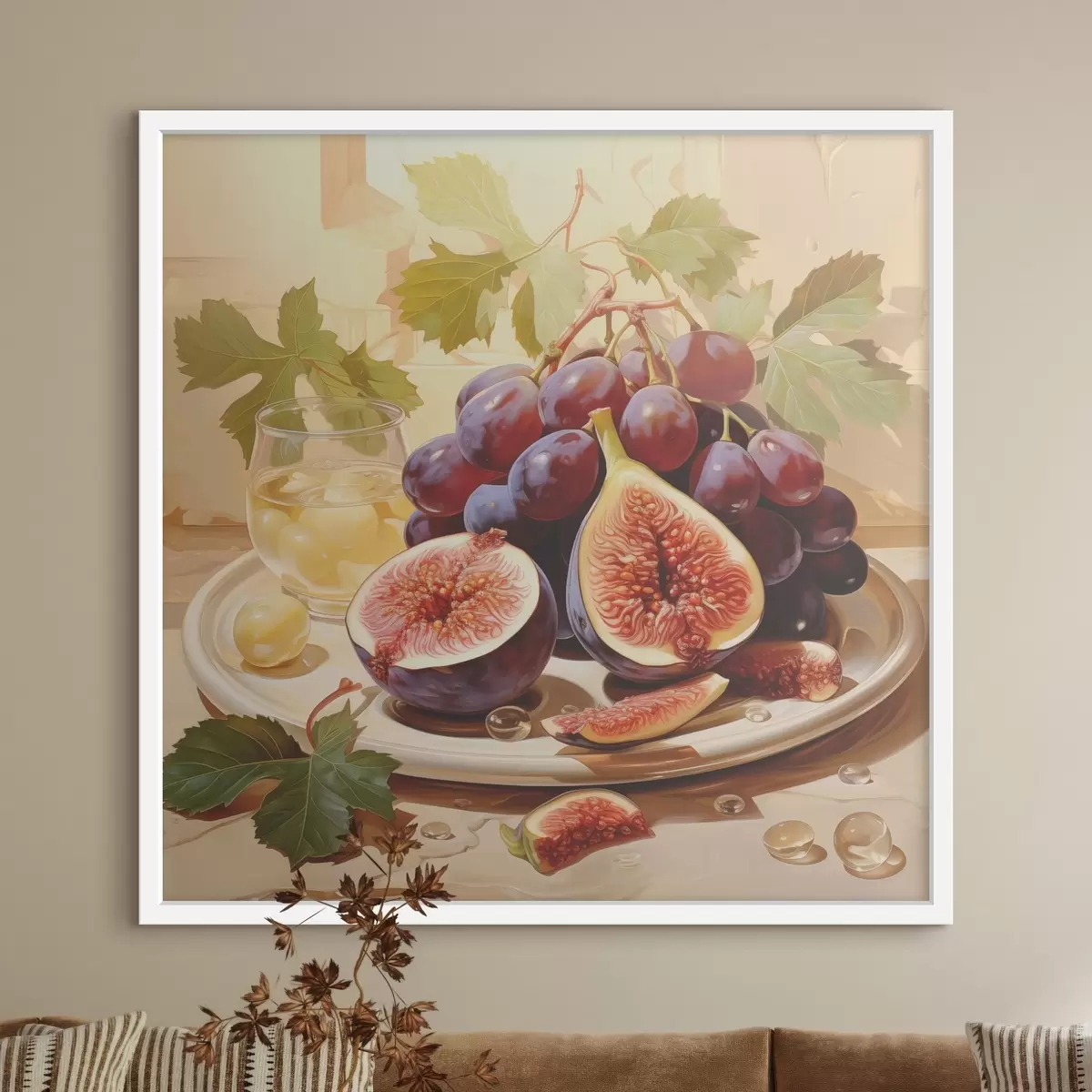 Poster Csendélet kék szőlővel és vágott füge olajfestményen, bézs és rózsaszínű táblára, olajfestményen Nr f39131