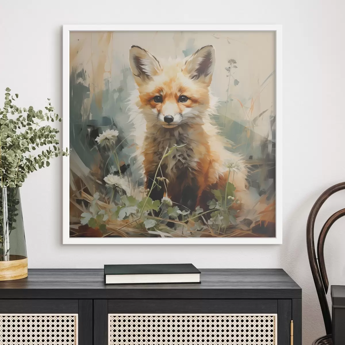 Poster Vörös róka ül a száraz fűben zöld háttéren. Olajfestmény Nr f39191