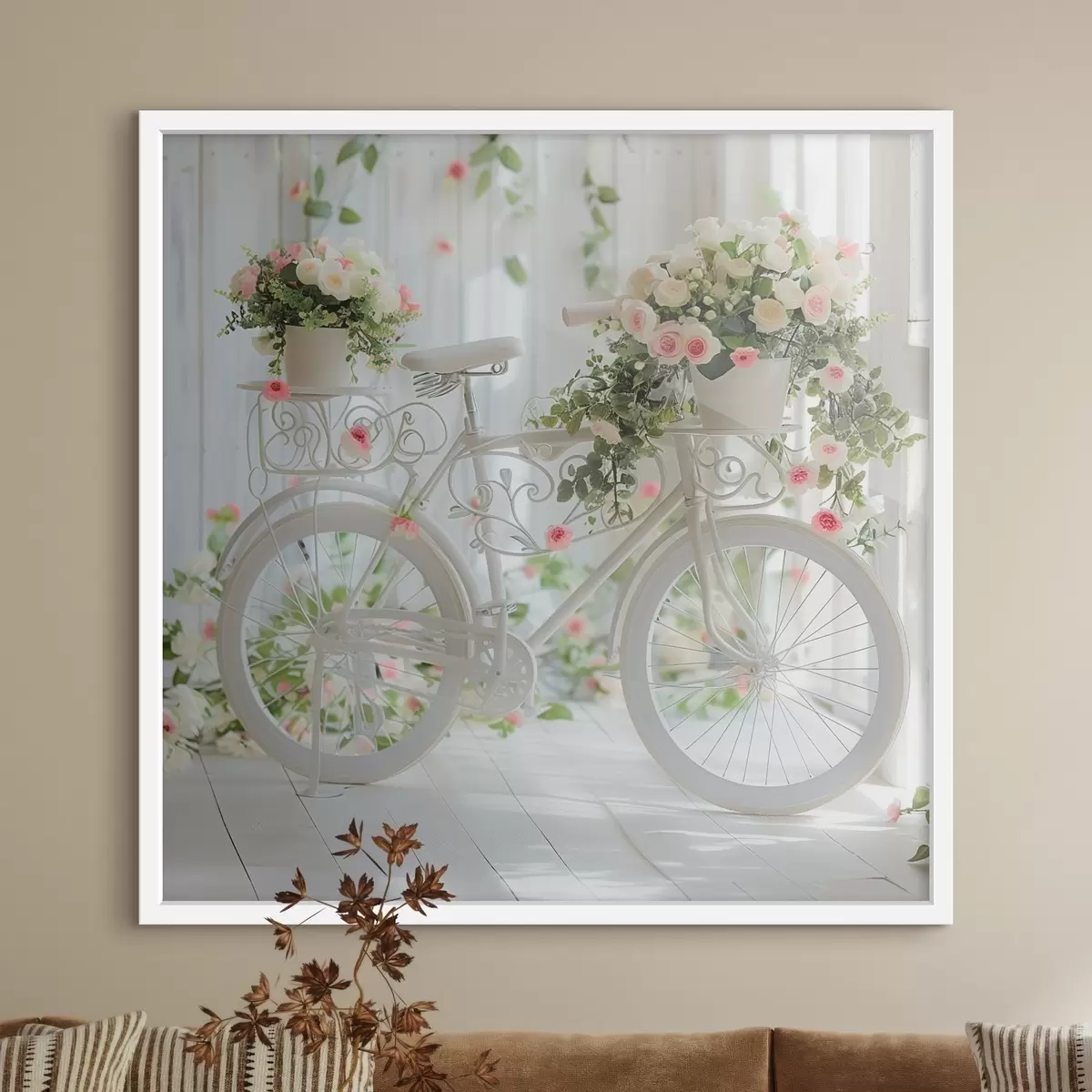 Plakát a sziklán Fehér kerékpár egy kosár virággal Provence-i stílusban f39243