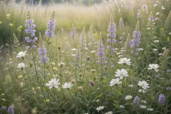 Poster Fehér százszorszépek és lila csillagfürt mező, magas fűvel a háttérben Nr f39404
