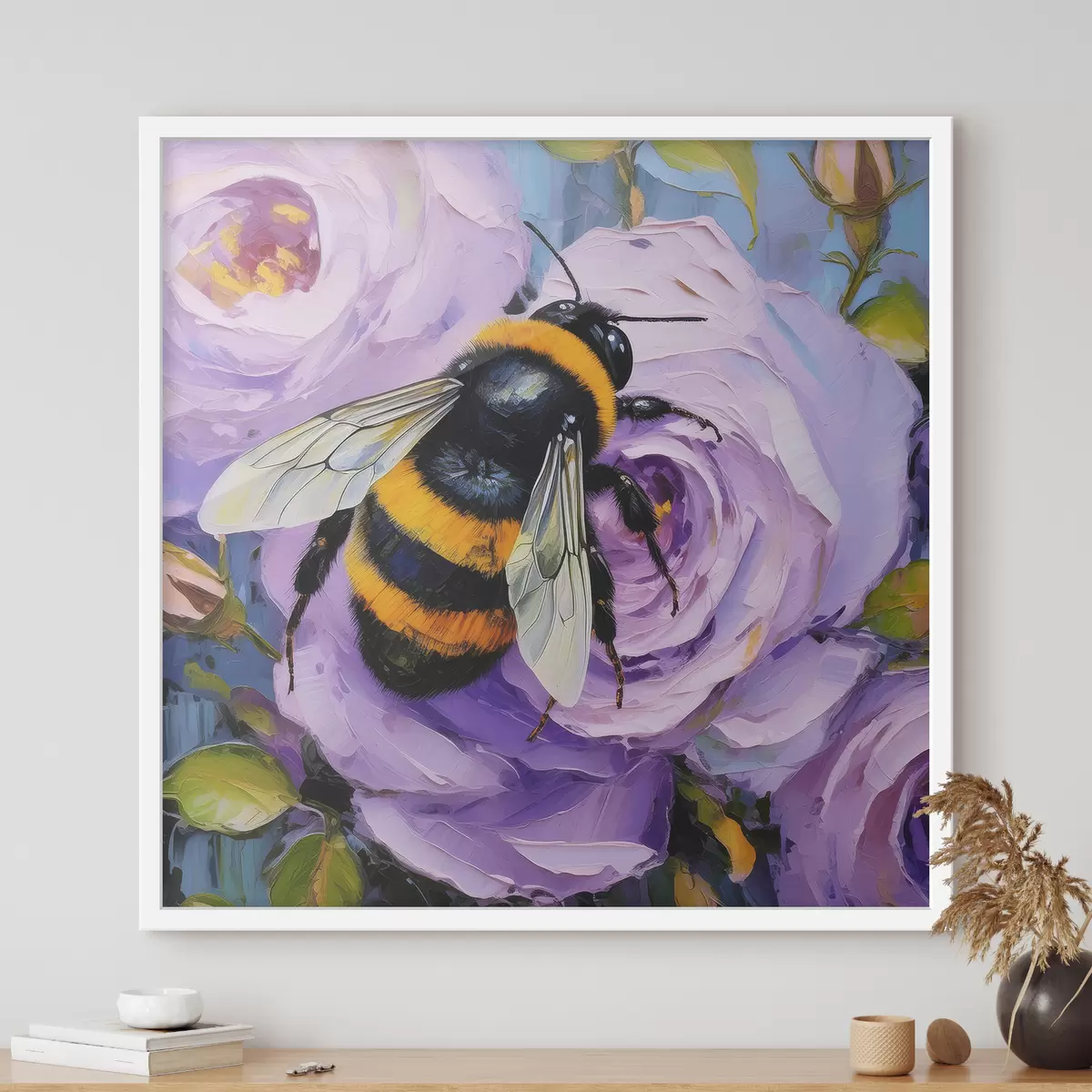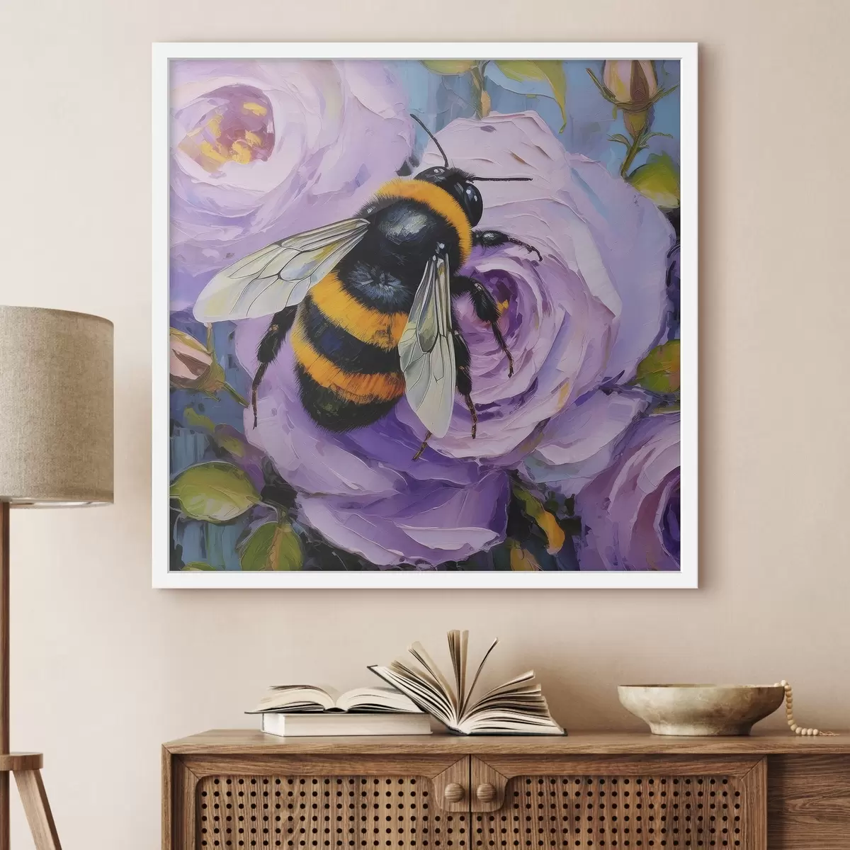 Poster Méh a rózsaszín bazsarózsákon, nyári virágok, olajfestmény, élénk ecsetvonások Nr f39410