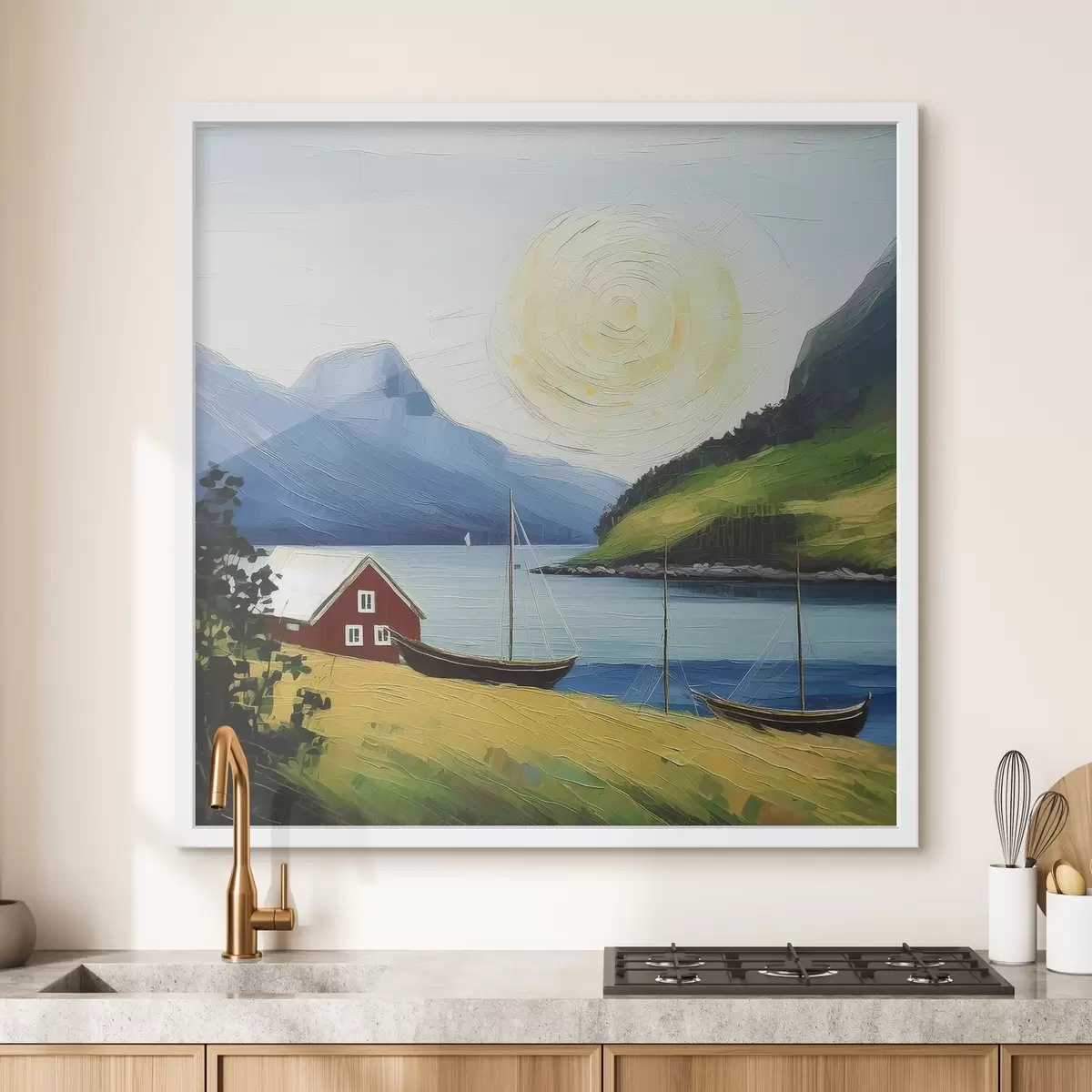 Plakát a sziklán Skandináv nyár, kis ház a tengerparton, nap a kék égen, hegyek f39423