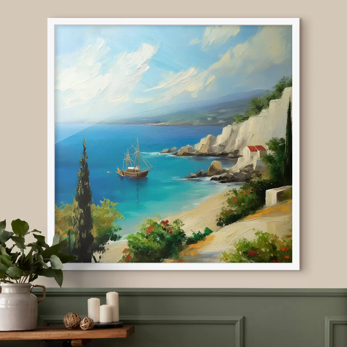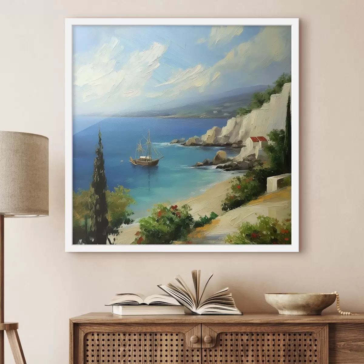 Poster Görögország tenger partja, hajó, kék víz, olajfestmény, nyári természet, sziklák, élénk ecsetvonások Nr f39425